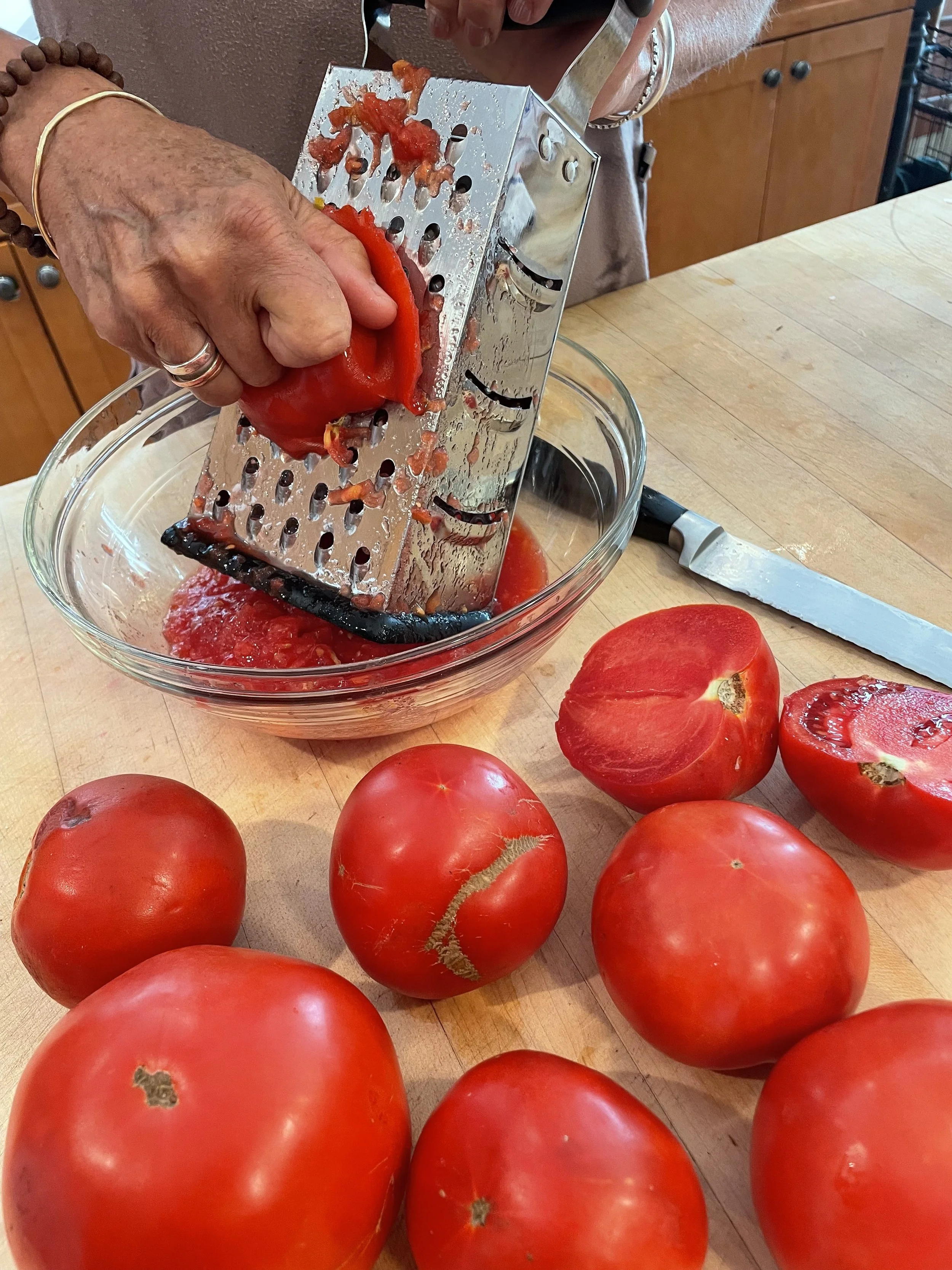 Tomatoes freeze beautifully and need very little prep. Once frozen, they’re ready to become soup, chili, sauce, or just about any spiced-up dish you can dream of. I prefer to freeze them raw: simply slice each tomato in half and grate the flesh on the large holes of a box grater, leaving the skins behind for compost. Pour the pulp into freezer bags, press out the air and freeze.